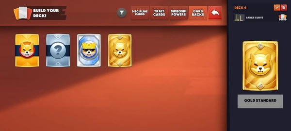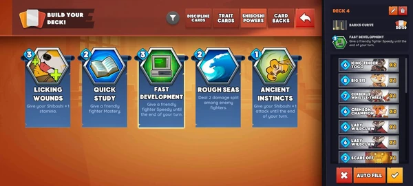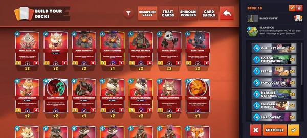 “I’m taken to his deck,” Shy points. “Now let’s click the deck and get started. Notice it takes me to the main screen to build my deck. Four main categories at the top here, Discipline, Trait cards, Shiboshi Powers and Card Backs,” Shytoshi points out to you. “Now, at the very bottom right corner, let’s click the red x. (We could also auto-fill the cards but let's pick some first.)”