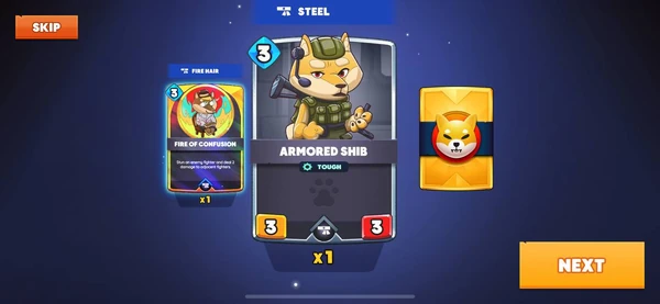 The second card is a Fighter! Armored Shib. The card has 3 Barks needed to play, 3 Attack and 3 Stamina. Notice also it has the Passive Power Tough (which means it takes one less damage each time it is attacked). It can be put in your deck if your Shiboshi has Steel headwear as noted above the card.
